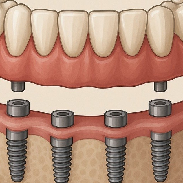 A life-changing solution replacing all teeth in an upper or lower arch using just 4 to 6 strategically placed implants. Often allows for fixed teeth on the same day ("Teeth in a Day") providing a stable, permanent alternative to traditional dentures.